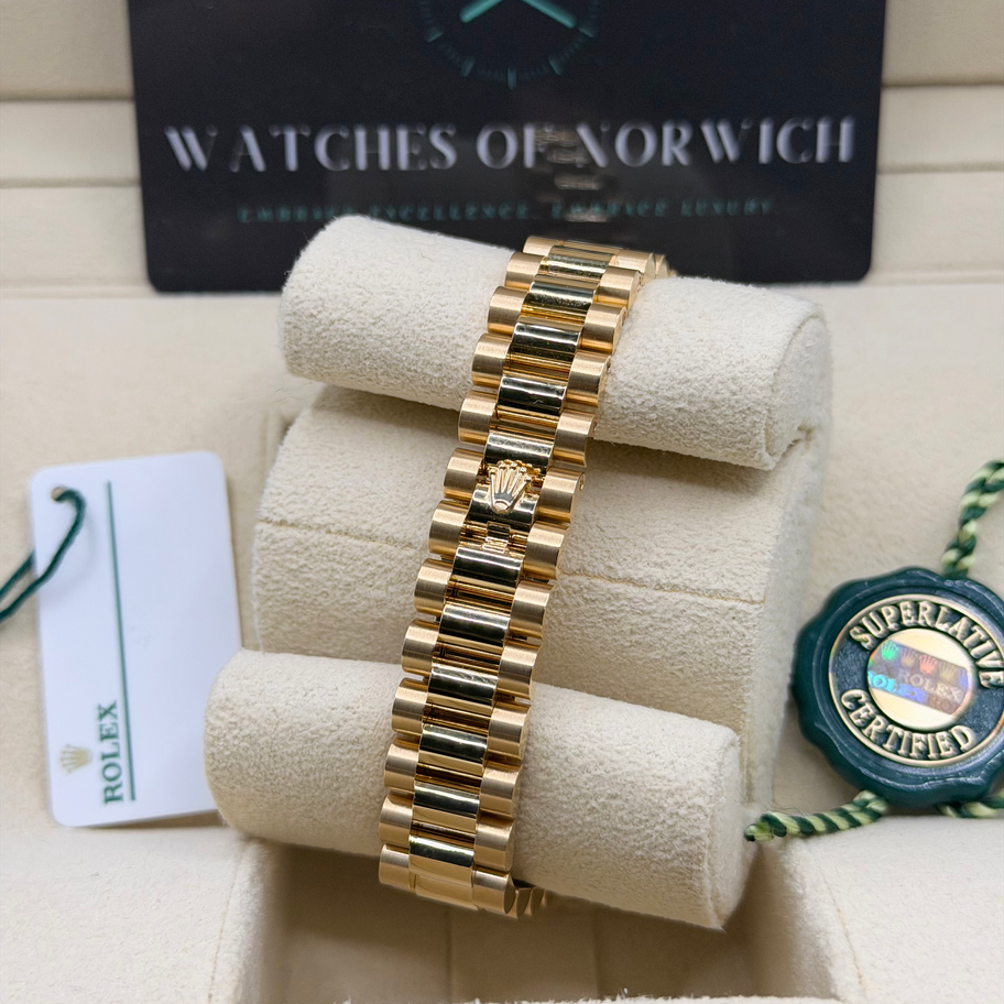 Watches of Norwich proudly presents this exceptional 2024 Rolex Datejust 31 reference 279178, featuring the elegant champagne dial with Roman numerals, paired with the iconic 18ct yellow gold fluted bezel and prestigious President bracelet.