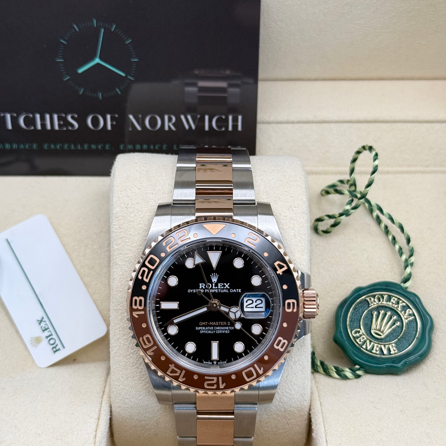 Watches of Norwich is pleased to present this 2019 Rolex GMT-Master II “Rootbeer”, reference 126711CHNR. Crafted from Rolex’s signature Oystersteel and 18ct Everose gold, this model features the popular black and brown Cerachrom bezel, a sleek black dial, and a robust Oyster bracelet. Offered as a full set and in very good condition